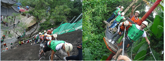 在高空攀岩项目中,传味人亲近大自然,感受青山绿水,放飞心灵,尽情展示传味人的风采。